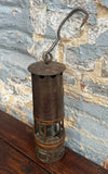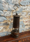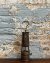 Ancienne lampe de mineur en fer, cuivre et verre Baccarat, numérotée C475. Début du 20ème siècle.